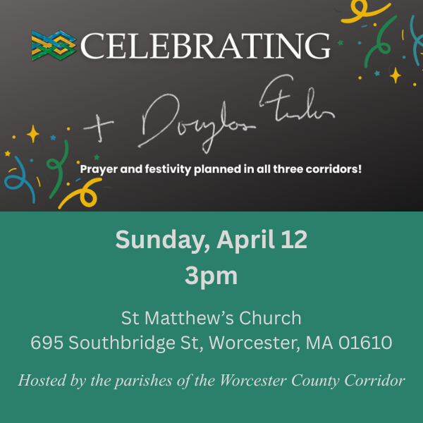 Parishioners from across the Worcester Corridor are warmly invited to a celebration honoring the ministry and leadership of The Right Reverend Douglas Fisher as he prepares for retirement. This joyful service of thanksgiving will take place on Sunday, April 12, at 3:00 PM at St. Matthew’s Church, 695 Southbridge Street, Worcester, MA. All are welcome to give thanks for Bishop Fisher’s years of service and witness in our diocesan community.