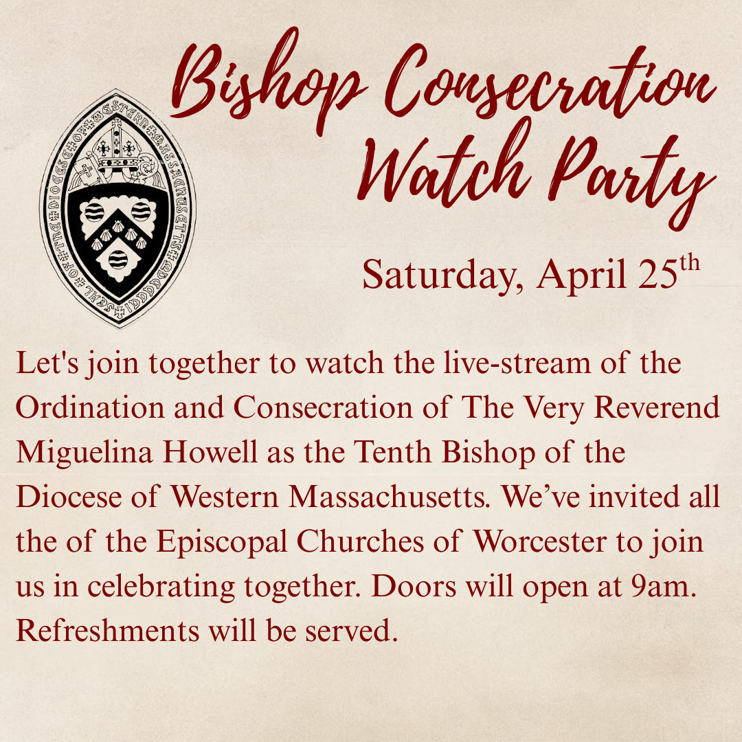 As the diocese looks ahead with hope, everyone is invited to gather for a watch party celebrating the consecration of the incoming bishop, The Very Reverend Miguelina Howell. The watch party will be held on Saturday, April 25, at 9:00 AM at All Saints Episcopal Church, 10 Irving Street, Worcester, MA. Join fellow Episcopalians to witness this historic moment together and welcome a new season of leadership.